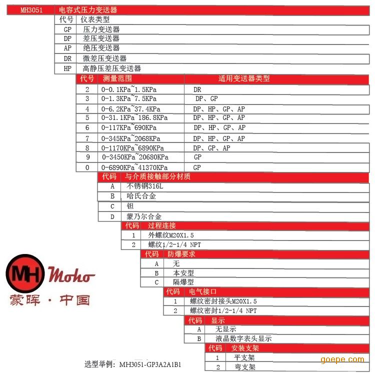 智能帶HART壓力變送器選型舉例:MH3051-GP3A2A1B1